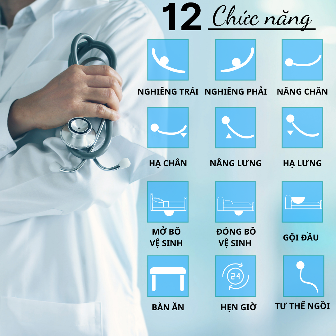 Giường y tế điện đa chức năng có điều khiển Chikara (BSK-D04) cung cấp cho người bệnh 12 chức năng tuyệt vời: