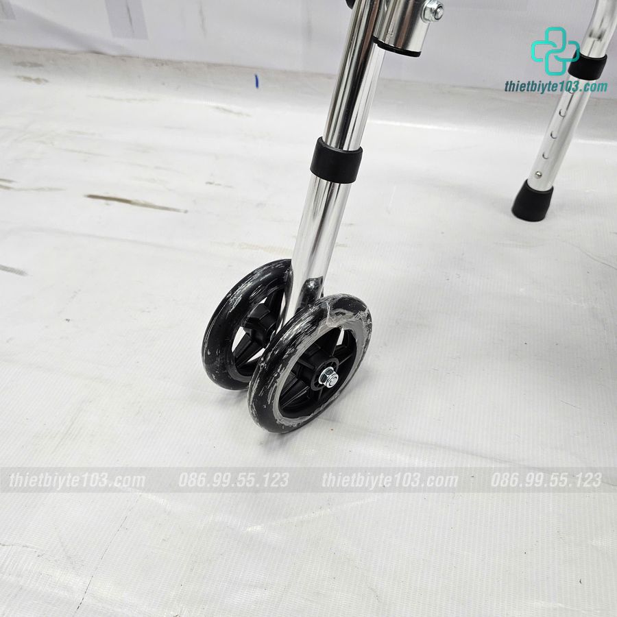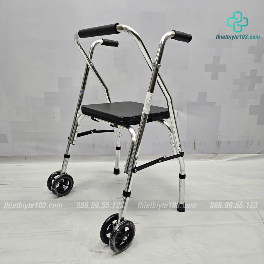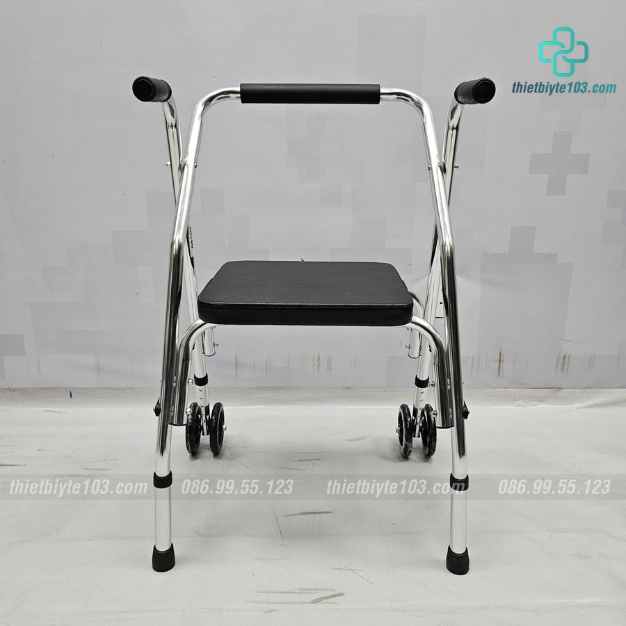 – Khung tập đi có ghế ngồi có hai bánh xe phía trước giúp cho việc di chuyển dễ dàng hơn.